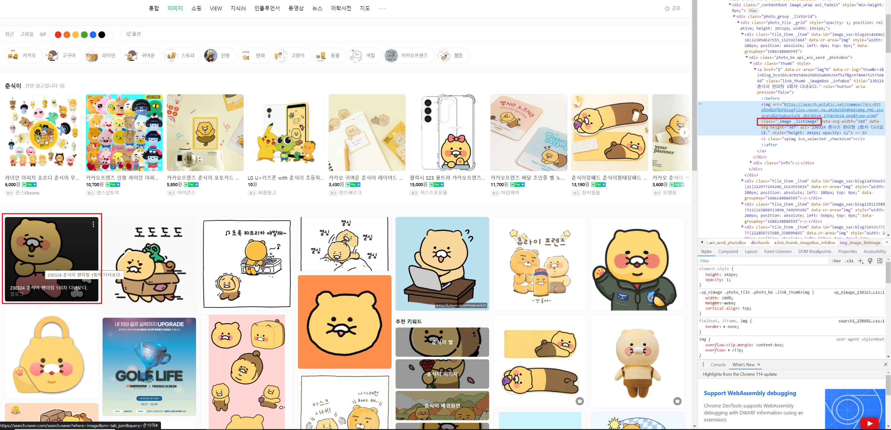 빨간색 박스로 선택한 사진의 class를 알아내서 저것을 선택하고 클릭하는 코드를 먼저 작성해보겠습니다.